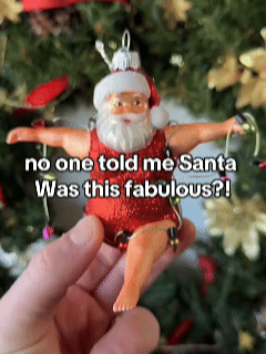 Forget boring ornaments — this funny Santa is striking a playful pose in a glittery red outfit, all tangled up in Christmas lights! He’s the perfect mix of festive cheer and cheeky humor that will make your tree stand out.