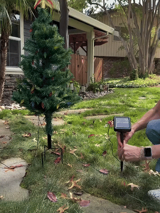 - Bright and 8 Lighting Modes: 50 count C6 strawberry string lights for each outdoor Christmas tree, the lights on them work amazing! Press the button on the solar panel to turn the lights on and 8 modes to choose from for light activity, they add such a nice touch to the outdoor Christmas decor, dancing trees will make you smile!